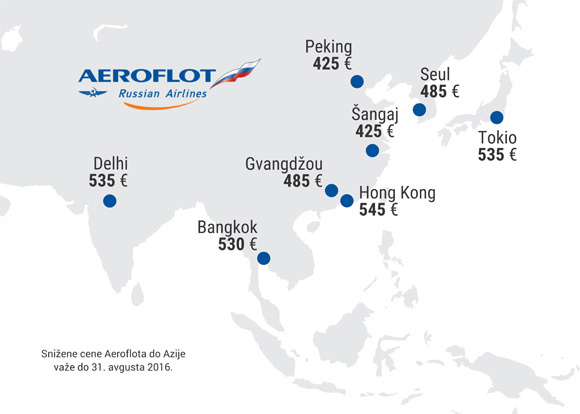Povratna karta u ekonomskoj klasi do Pekinga ili Šangaja sada je samo 425 evra, dok je Gvagdžou 485 evra. Pored izuzetne cene dodatna povoljnost koju nudi Aeroflot je da putnik u ceni karte ima uključen duplo veći prtljag od uobičajenog – 2 kofera do 23 kilograma.
