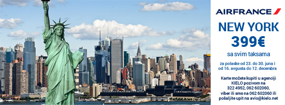 Air France je objavio da će u utorak i sredu, 23. i 24. februara, prodavati karte za Njujork po ceni od 399 evra! Ta cena uključuje i sve takse, posluženje na svim letovima, kao i 2 komada prtljaga umesto uobičajenog 1 komada do 23 kilograma.