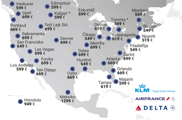 Air France / KLM / Delta alijansa nam i dalje nudi najbolje cene za putovanja do gradova u SAD i Kanadi. U ovom pregledu pogledajte cene za putovanja tokom čitave godine, osim u periodu neposredno pre katoličkog Božića.