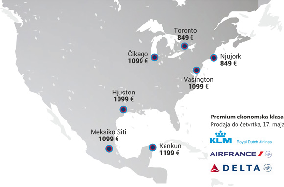 Njujork i Toronto su tokom promocije samo 849 evra na premijum klasi, Čikago, Vašington i Meksiko Siti po 1099 evra, Kankun je 1199 evra.