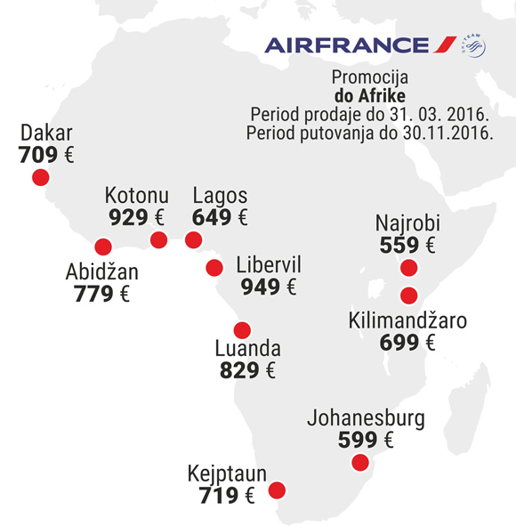 Povratna karta u ekonomskoj klasi do Lagosa je 649 evra sa svim uračunatim taksama i nadoknadom za izdavanje karte. Dakar je 709 evra, Kilimandžaro 699 evra, a Najrobi, glavni grad Kenije, na promociji košta samo 559 evra.