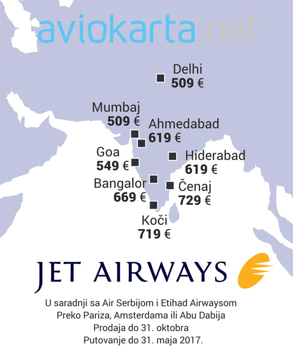 Do ovih gradova iz Beograda Jet Airways leti u saradnji sa Air Serbijom i Etihad Airwaysom, preko Pariza, Amsterdama ili Abu Dabija.
