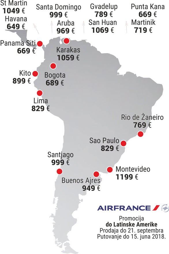 Povratna karta do Buenos Ajresa je 949 evra. Bogota, glavni grad Kolumbije, je 689 evra, Karakas, glavni grad Venecuele, je 1059 evra, Kito je 899 evra, dok je San Huan 1049 evra, sa svim taksama, prtljagom do 23 kilograma, kao i naknadom za izdavanje karte.
