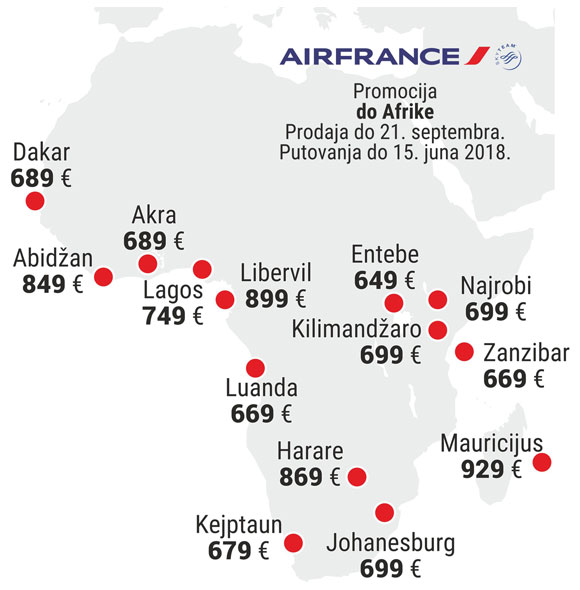 Na ovoj promociji je još zanimljivija Afrika. Mnogi gradovi po čitavom kontinentu koji inače nisu pristupačni putnicima iz Beograda sada imaju znatno bolje cene. Glavni grad Gane je sada 689 evra, koliko je tokom promocije i glavni grad Senegala, glavni grad Angole je 669 evra, koliko košta i karta do prelepog Zanzibara. Još je mnogo promotivnih cena za čitavu Afriku, neke od njih možete videti na našoj mapi, za ostale nas možete pozvati.