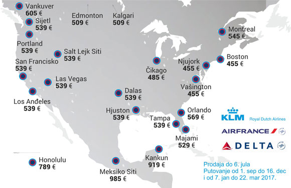 Air France / KLM i Delta alijansa su nam ponudili nove cene za putovanje do gradova u Sjedinjenim Državama i Kanadi za kupovinu do 6. jula. U pitanju su promotivne cene, za putovanja koja započinju nakon 1. septembra.