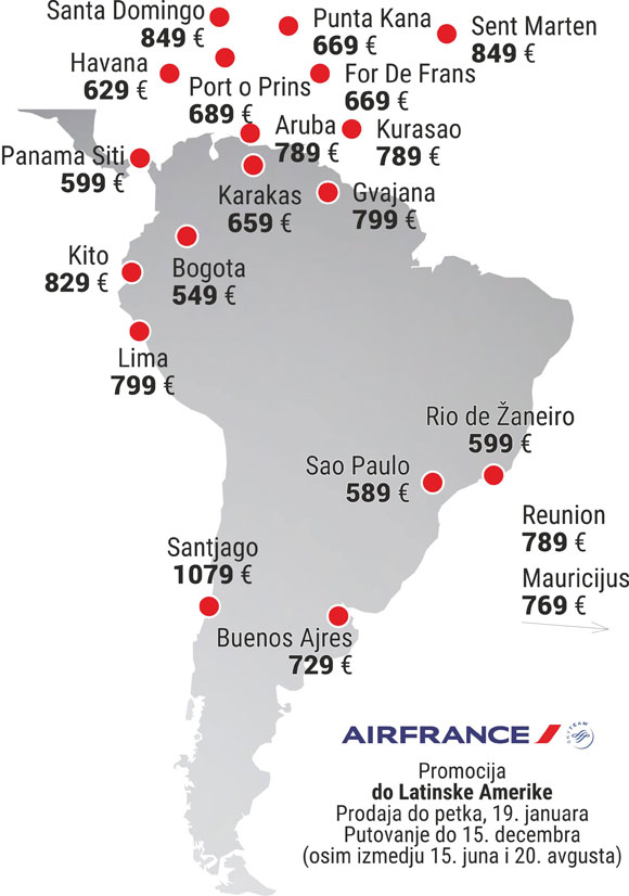 Air France & KLM su objavili veliku promotivnu akciju za sve gradove do kojih lete u Centalnoj i Južnoj Americi, kao i na Karibima – značajno niže cene za Buenos Ajres, Rio de Žaneiro, Sao Paolo, Bogotu, Limu, Panama Siti, Havanu, Punta Kanu i mnogo drugih destinacija.