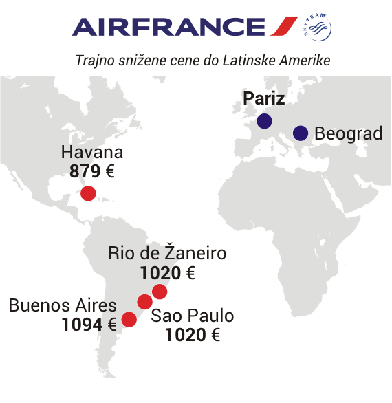 Po novom cenovniku najniže cene do Havane, Rio de Žaneira, Sao Paola i Buenos Ajresa su snižene za preko 200 evra.
