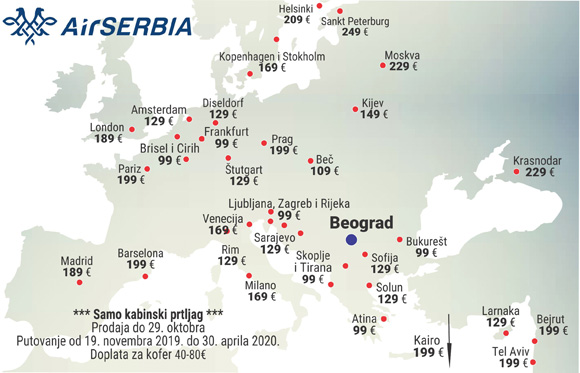 Ova ponuda važi za putovanja između Beograda i 35 destinacija u Evropi, Severnoj Africi i na Bliskom Istoku, skoro za sve destinacije do kojih Er Srbija leti u zimskom redu letenja, za putovanja počev od 19. novembra ove godine, do 30. aprila 2020. godine. Promotivne cene se odnose samo na letove na kojima je Er Srbija ponudila promotivnu klasu.