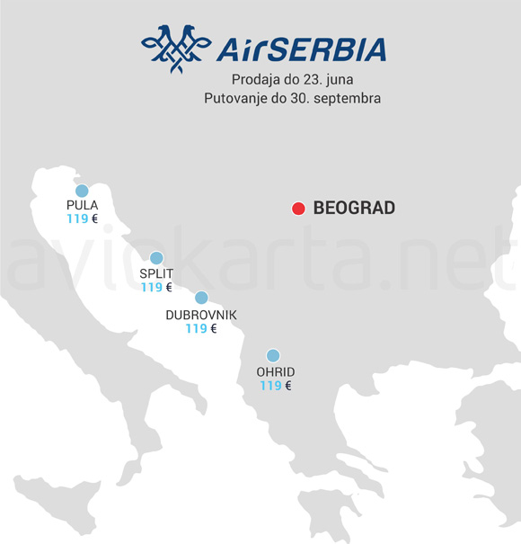 Air Serbia je objavila promotivnu akciju na ekonomskoj klasi do tri grada do kojih leti direktno na jadranskom moru. Promocija se dakle odnosi na putovanja u Split, Pulu i Dubrovnik tokom letnjih meseci, ali i za Ohrid u Makedoniji.