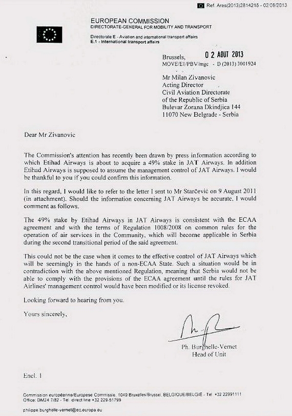 Evropska komisija je na ovo upozorila Direktorat civilnog vazduhoplovsta u pismu koje je uputila pre dve godine (09. avgusta 2011) tadašnjem direktoru Nebojši Starčeviću. Tada je, na osnovu informacija da je u planu privatizacija Jat Airwaysa, EK dala preporuke u kojima je navela da osim što je neophodno da Jat ostane u većinskom vlasništvu neke evropske kompanije i efektivno upravljanje ovom kompanijom ne sme biti prepušteno nekome van ECAA inače će najkasnije do kraja drugog prelaznog perioda primene ECAA sporazuma Jat ostati bez licence, odnosno bez privilegija koje imaju domaći (evropski) avioprevoznici.