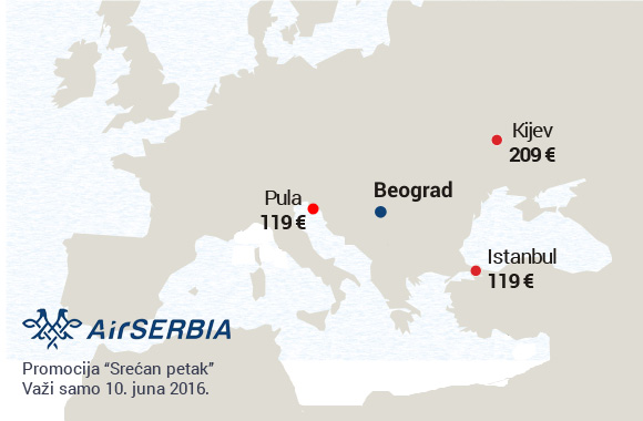 Nova jednodnevna promotivna akcija Air Serbije, poznata pod imenom "Srećni petak" je objavljena za 10. jun.