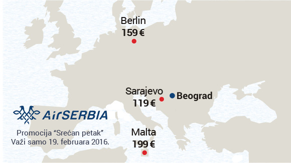 Povratna karta u ekonomskoj klasi do Sarajeva za 119 evra, do Berlina za 159 evra, i do Malte za 199 evra.