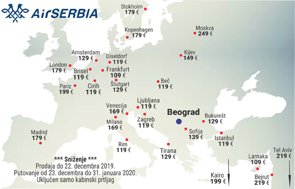 Ova ponuda važi za putovanja između Beograda i više destinacija u Evropi, Severnoj Africi i na Bliskom Istoku, za destinacije do kojih Er Srbija leti u zimskom redu letenja – putovanja moraju da se završe do 31. januara 2020. godine! Promotivne cene se odnose samo na letove na kojima je Er Srbija ponudila promotivnu klasu.