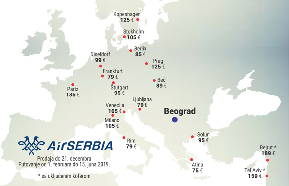 Ova ponuda važi za putovanja između Beograda i 17 gradova u Evropi i na Bliskom Istoku! Promotivne cene se primenju na karte u jednom pravcu, kao i na povratne karte, za putovanja u periodu od 1. februara do 15. juna 2019.
