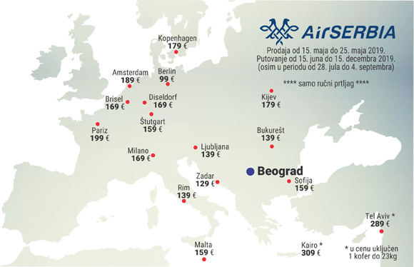 Air Serbia tokom 10 dana u maju nudi snižene cene karata za putnike u ekonomskoj klasi koji putuju samo sa ručnim prtljagom, mada postoji i deo ponude za putovanja sa uključenim koferom!