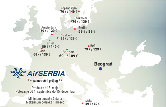 Ova ponuda važi za putovanja između Beograda i deset gradova u Evropi do kojih leti Air Serbia! Do Berlina povratna karta košta 89 evra, dok je u jednom pravcu 59 evra. Do Amsterdama povratna karta tokom promocije je 129 evra, u jednom pravcu 79 evra.