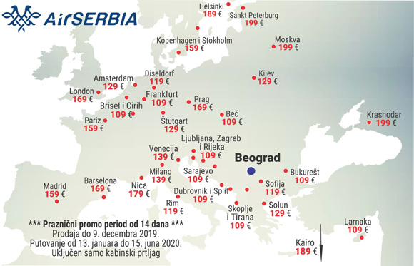 Ova ponuda važi za putovanja između Beograda i brojnih destinacija u Evropi, Severnoj Africi i na Bliskom Istoku, skoro za sve destinacije do kojih Er Srbija leti u zimskom redu letenja, za putovanja počev od 13. januara do 15. juna 2020. godine. Promotivne cene se odnose samo na letove na kojima je Er Srbija ponudila promotivnu klasu.
