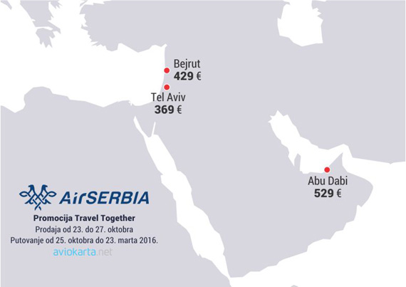Kako bi predstojeću proslavu drugog rođendana obeležila na poseban način, Air Serbia je pokrenula promotivnu kampanju pod nazivom PUTUJTE ZAJEDNO u kojoj svojim putnicima nudi atraktivne cene aviokarata iz Beograda do 33 destinacije u regionu, Evropi i na Bliskom istoku – uz uslov da dva putnika putuju zajedno.