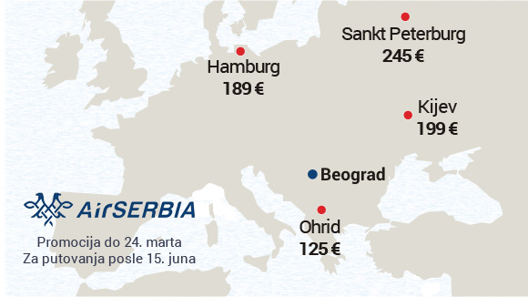 Air Serbia je objavila da će od 15. juna leteti za još 4 grada – Hamburg u Nemačkoj, Sankt Peterburg u Rusiji, Kijev u Ukrajini, kao i Ohrid u Makedoniji. Povodom otvaranja novih linija Air Serbija je ponudila ograničenu promotivnu prodaju, tako da ćete do četvrtka, 24. marta, biti u prilici da kupite karte po znatno nižim cenama do ova 4 grada.