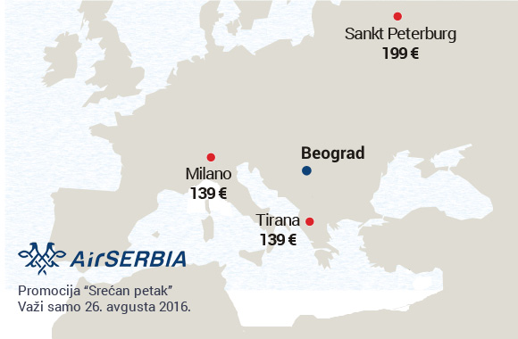Nova jednodnevna promotivna akcija Air Serbije, poznata pod imenom "Srećni petak" je objavljena za 26. avgust.