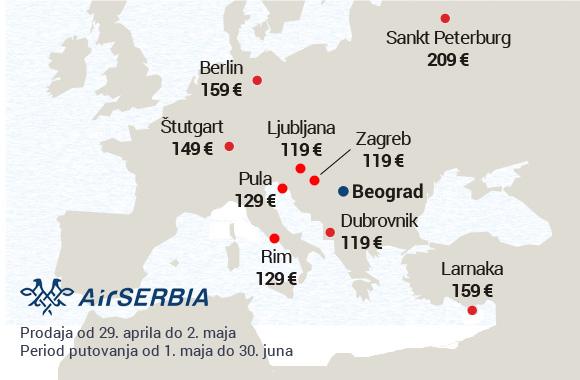 Povratna karta u ekonomskoj klasi do Zagreba, Dubrovnika i Ljubljane košta 119 evra, do Pule i Rima po 129 evra, Berlina i Larnake 159 evra, a do Sankt Peterburga 209 evra.
