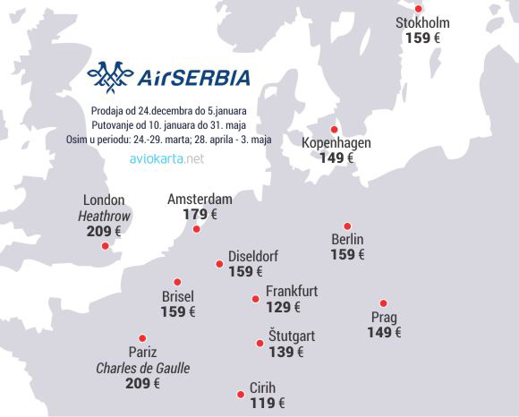 Povratna karta u ekonomskoj klasi do Praga i Kopenhagena su po 149 evra, dok su karte do Berlina, Brisela, Diseldorfa ii Stokholma 159 evra. Pariz i London su tokom ove promocije po 209 evra.