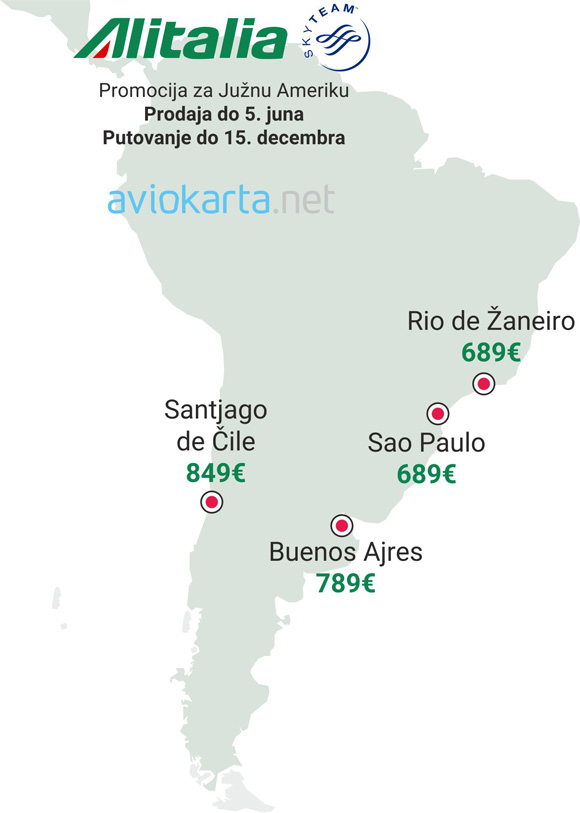 Alitalia je započela promotivnu prodaju za 4 najvažnija grada Južne Amerike. Putnici iz Srbije mogu leteti do Brazila, Čilea ili Argentine sa presedanjem na aerodromu u Rimu uz mogućnost da koriste i letove Air Serbije između Beograda i Rima.