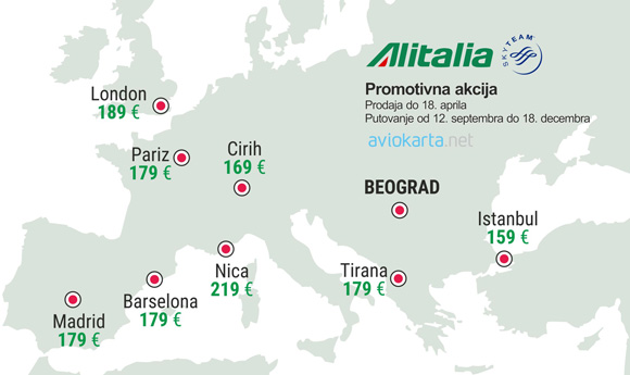 Alitalia je objavila promociju za gradova Italije, Evrope i Severne Afrike. Promotivna prodaja će trajati do 18. aprila, a odnosi se na putovanja u periodu od 12. septembra do 18. decembra. U tom periodu treba da se započne i završi putovanje. Maksimalni boravak po promotivnoj ceni je ograničen na 3 nedelje.