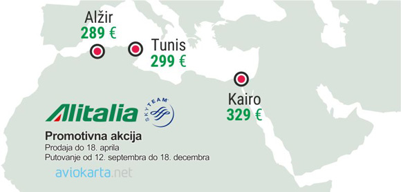 Promocija se odnosi i na najpopularnije destinacije u Severnoj Africi – povratna karta do Alžira je 289 evra, Tunis je 299 evra, dok je Kairo tokom promocije 329 evra.