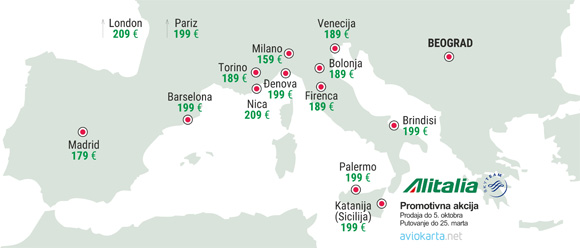 Alitalia je objavila promociju za gradove u Italiji i Evropi. Promotivna prodaja će trajati samo do četvrtka, 5. oktobra, za putovanja u periodu do 25. marta 2018. U tom periodu treba da se započne i završi putovanje. Boravak po ovoj promotivnoj ceni je ograničen na 1 mesec.