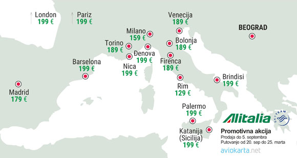 Alitalia je objavila promociju za gradove u Italiji i Evropi. Promotivna prodaja će trajati samo do utorka, 5. septembra, za putovanja u periodu od 20. septembra do 25. marta. U tom periodu treba da se započne i završi putovanje. Boravak po ovoj promotivnoj ceni je ograničen na 1 mesec.
