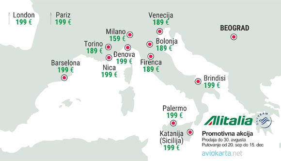 Alitalia je objavila promociju za gradove u Italiji i Evropi. Promotivna prodaja će trajati do srede, 30. avgusta, a odnosi se na putovanja u periodu od 20. septembra do 15. decembra. U tom periodu treba da se započne i završi putovanje. Boravak po ovoj promotivnoj ceni je ograničen na 1 mesec.