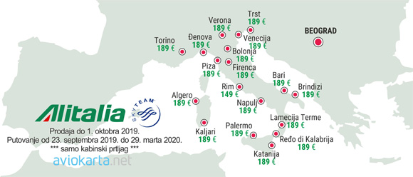 Alitalia je objavila promociju za italijanske gradove i prodaja će trajati do utorka, 1. oktobra 2019. godine – za putovanja od oktobra, pa sve do 29. marta.