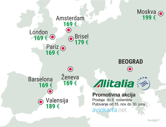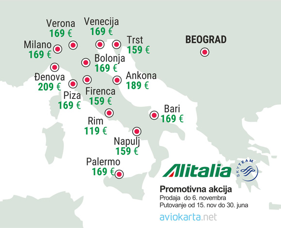 Alitalia je objavila novu promociju za nekoliko gradova u Italiji i Evropi. Promotivna prodaja će trajati do 6. novembra, a odnosi se na putovanja u periodu od 15. novembra do 30. juna naredne godine. U tom periodu treba da se započne i završi putovanje. Boravak po ovoj promotivnoj ceni je ograničen na 1 mesec.