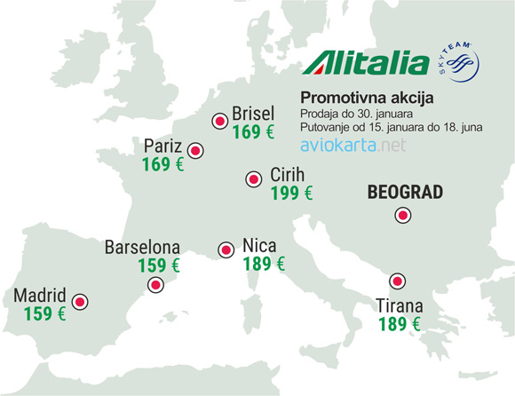 Alitalia je produžila promociju za nekoliko gradova u Italiji i Evropi. Promotivna prodaja će trajati do 30. januara, a odnosi se na putovanja u periodu od 15. januara do 18. juna ove godine. U tom periodu treba da se započne i završi putovanje. Boravak po ovoj promotivnoj ceni je ograničen na 1 mesec.