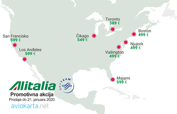 Nakon promocija za Italiju i Evropu Alitalia je objavila i niže cene za gradove Severne Amerike. To su gradovi za koje Alitalia leti iz Beograda preko Rima.