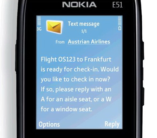 Austrian Airlines je omogućio putnicima da se za let registruju putem preko SMS-a. Putnici koji su prijavljeni za ovaj servis dobiće poziv za registraciju za let (check-in) putem SMS-a. SMS poziv će stići nakon ulaska u period od 24 časa pred planirano poletanje. (oko 23 sata pre leta).