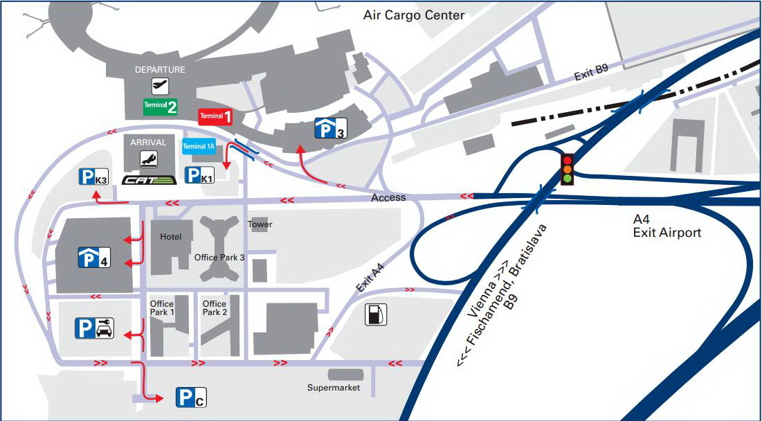 Na bečkom aerodromu postoji nekoliko različitih parkirališta ukupnog kapaciteta za 22.000 vozila. Nedaleko od pristanišnih zgrada se nalaze dva parkirališta za kraće zadržavanje gde svaki započeti sat parkinga košta 4,5 evra.
