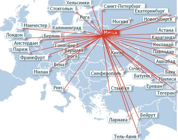 Kako nam je rečeno u Ministarstvu saobraćaja planirano je da beloruska nacionalna aviokompanija Belavia uspostavi redovan saobraćaj od Minska do Beograda. Najrealnija opcija je da Belavia poveže Minsk sa Beogradom preko Budimpešte u okviru nove kružne linije: Minsk-Budimpešta-Beograd-Minsk.