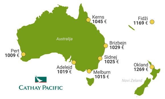 Povratne karte u ekonomskoj klasi do australijskih gradova Sidnej, Pert, Melburn, Adelejd, Brizbejn, Kerns koštaju tek malo iznad hiljadu evra i uključuju sve takse kao i uobičajenu nadokadu za izdavanje karte. Sve cene i destinacije koje su na promociji možete videti na priloženoj mapi.