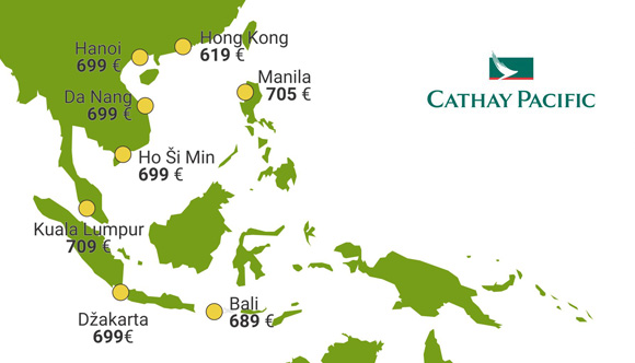 Do gradova u Evropi gde sleće Cathay Pacific putnici iz Srbije mogu otputovati ne samo na letovima Air Serbije već i Lufthanse ili Alitalije. U okviru promocije Cathay Pacifica snižene su cene do Australije, Azije, Novog Zelanda i Fidžija.