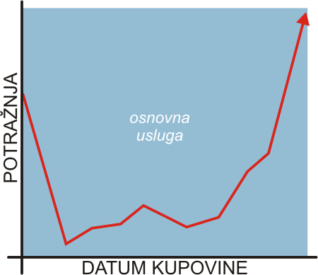 Zato je grafikon cena lowcost prevoznika najbliži latiničnom slovu “W”, gde je prvi vrh najbliži datum, zatim sledi pad cena do najnižih mogućih, potom imamo novi vrh kod nekog bitnog događaja (povećane tražnje), nakon koga se cene opet obaraju i na kraju poslednji vrh je prema kraju perioda kupovine (grafikon levo)