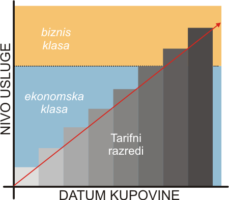 Iz tog razloga prevoznik neće u prodaju pustiti karte za veoma kasne datume po niskim cenama. Na taj način on utiče na putnike da biraju ranije datume kada su niže cene karata kako bi popunjavao prve letove i osigurao što veću popunjenost na tim letovima. Paralelno sa popunjavanjem aviona doći će i do porasta cena karata na bliskim letovima pošto će ostajati sve manje slobodnog mesta.