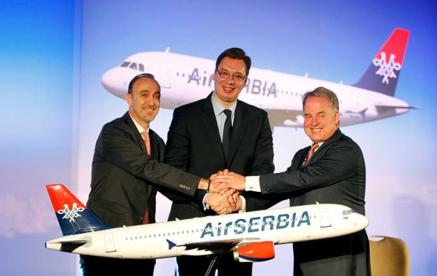 Foto: Dane Kondić (levo) se rukuje sa potpredsednikom Vlade Srbije Aleksandrom Vučićem (u sredini) i sa Džejmsom Hoganom, izvršnim direktorom Etihada (desno)