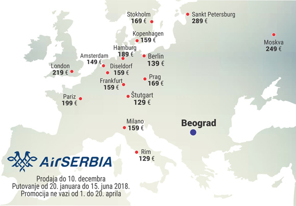 Air Serbia do 10. decembra putnicima nudi snižene cene karata za 15 svojih destinacija za putovanja u periodu od 20. januara do 15. juna naredne godine. Ako sada možete da isplanirate neko putovanje za narednu godinu ovo je odlična prilika da kupite aviokartu.