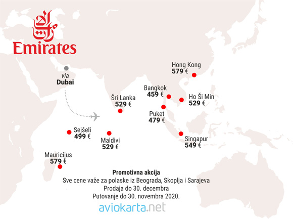 Promocija se odnosi na putovanja iz Beograda, Skoplja ili Sarajeva – preko Dubaija – do koga se stiže direktno kompanijom flydubai, partnerom kompanije Emirates.
