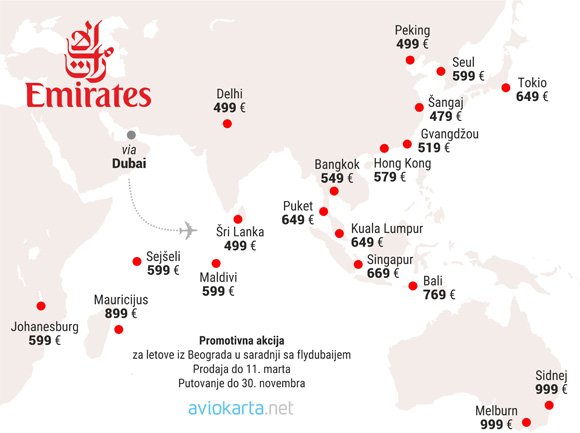 Promocija se odnosi na putovanja iz Beograda, preko Dubaija, do koga se stiže direktno flydubaijem, partnerskom kompanijom Emiratesa.