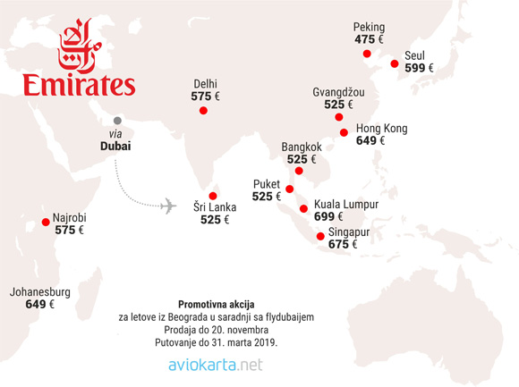 Promocija se odnosi na putovanja iz Beograda, preko Dubaija, do koga se stiže direktno flydubaijem, partnerskom kompanijom Emiratesa.