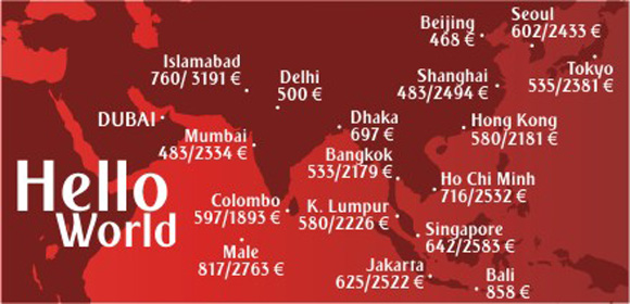 Povratna karta u ekonomskoj klasi sa svim uračunatim taksama do Delhija je 499 evra dok je cena za Mumbai 483 evra. Na sniženju su i popularne turističke destinacije: Džakarta od 625 evra i Kolombo na Šri Lanki od 597 evra.