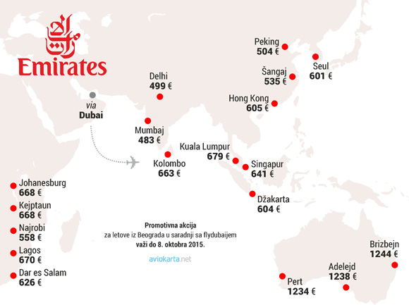 Promocija se odnosi na putovanja iz Beograda, preko Dubaija, do koga se stiže direktno flydubaijem, partnerskom kompanijom Emiratesa.